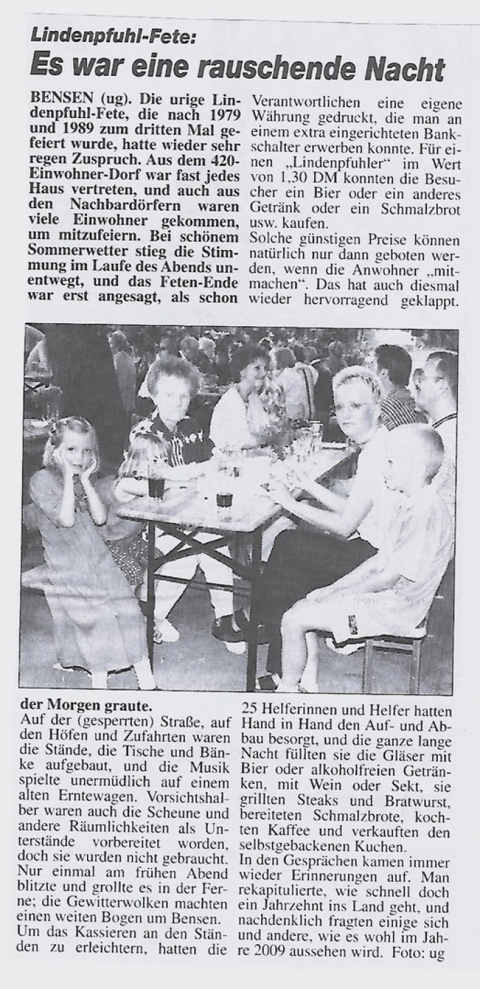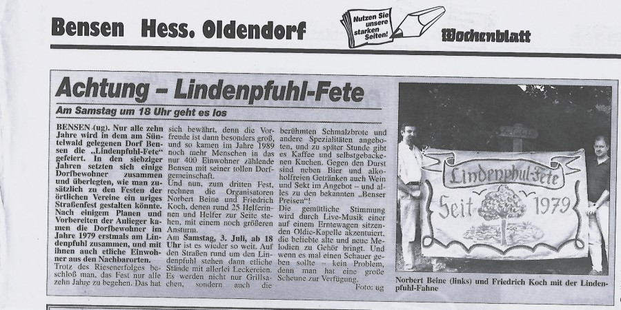 Vielleicht erinnert sich der eine oder andere an die legendären Lindenpful Strassenfeste. Begonnen hatte alles 1979. Beim leeren des Sparkasten- immer Donnerstags- im Gasthaus Korf ( Streyer)kamen Norbert Beine, Friedrich Koch, Heinrich Lange sowie weitere " Mitleerer" auf die Idee ein Strassenfest am Lindenphul durchzuführen. Danach erfolgte eine kurze Einladung an alle Einwohner, die rund um den Lindenpful wohnten und schon war die Lindenpfuhl- Fete geboren. Alles weitere kann aus den u.a. Presseberichten entnommen werden. Dieses Strassenfest fand nach 1979 dann 1989 und 1999 statt. Beim ersten Strassenfest wurde als " Besonderheit" Hintenhoch ausgeschenkt- einzeln für 70 Pfennig-; bei Abnahme von fünf Stück serviert auf einem vorbereiteten Brett wurden 3,00 DN berechnet. Da der Hintenhoch noch nicht so bekannt aber sehr süffig war, war in kurzer Zeit der Vorrat erschöpft. Leider gibt es kaum Bilder von diesen Veranstaltungen; wer jedoch welche besitzt- biite an mich. Ich würde mich freuen.