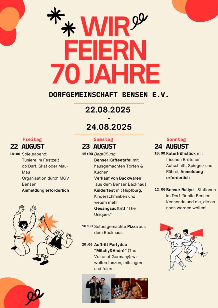 Ein wunderschönes Fest ist zu Ende. 3 tolle Tage in Bensen. Die Dorfgemeinschaft Bensen hat vom 22.- 24. August 2025 das 70 jährige Bestehen gebührend gefeiert. Am Freitag ab 18.oo Uhr einen Spieleabend, der vom MGV Bensen organisiert wurde. Ca. 60 TeilnehmerInnen konnten Dart, Skat oder MauMau spielen. Andreas Franke als Vorsitzender des MGV Bensen begrüßte alle Anwesende und gab die Spielregeln bekannt. Auch die spätere Auswertung lag in seinen Händen. Alle hatte einen großen Spass und würden diesen Spieleabend gern wiederholen. Der Samstag begann mit einer Kaffeetafel mit hausgemachten Torten und Platenkuchen aus dem Backhaus. Um 15.oo Uhr begrüßten Nina Schulte-Schimonek ( 1. Vors.) und Georg Köpke ( 2. Vor.) die zahlreichen Gäste. Hierbei gingen sie kurz auf die Geschichte der Dorfgemeinschaft ein. Für die Kinder war auf dem Sportplatz eine Hüpfburg aufgebaut; desweiteren gab es Kinderschminken und vieles mehr. Am späten Nachmittag füllte sich das Zelt sowie der Platz vorm Dorfgemeinschaftshaus. Zwischendurch wurde im Dorfgemeinschaftshaus von Katja Wömpener ein Film mehrmals über 70 Jahre Dorfgemeinschaft gezeigt.Die Besucher warteten schon auf die leckere Pizza, die ab 18.oo Uhr aus dem Backofen kam. Ab 20.oo Uhr konnte das Tanzbein geschwungen werden, denn dann stand das " Partyduo Mitchy&Andre`"auf der Bühne. Das Partyduo- bekannt aus " The Voice of Germany" - hatte Songs für jeden Geschmack. Von der ersten Minute an waren alle Tanzfreudigen auf der Tanzfläche. Von Stunde zu Stunde stieg die Stimmung. Ein ganz,ganz toller Abend. Am Sonntag wurde ab 10.oo Uhr mit einem Frühstück das Fest begonnen. Wieder ca. 60 Personen konnten gemeinsam das leckere Frühstück u.a. mit Spiegel-und Rührei geniesen. Die Dorf Rallye mit 8 Stationen beendete das Fest. Es gab nur lobende Worte für den Vorstand und seine vielen Helfer. Hier kann man ganz einfach sagen: Das Ehrenamt wird in Bensen groß geschrieben. Herzlichen Dank an alle.